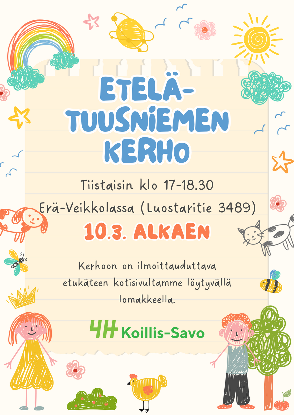 Kerho kokoontuu tiistaisin klo 17-18.30 Erä-Veikkolassa osoitteessa Luostaritie 3489, Tuusniemi. Kerho alkaa 10.3. tai kunnes minimiosallistujamäärä (5) on täyttynyt. Kerho ei kokoonnu koulujen loma-aikoina.