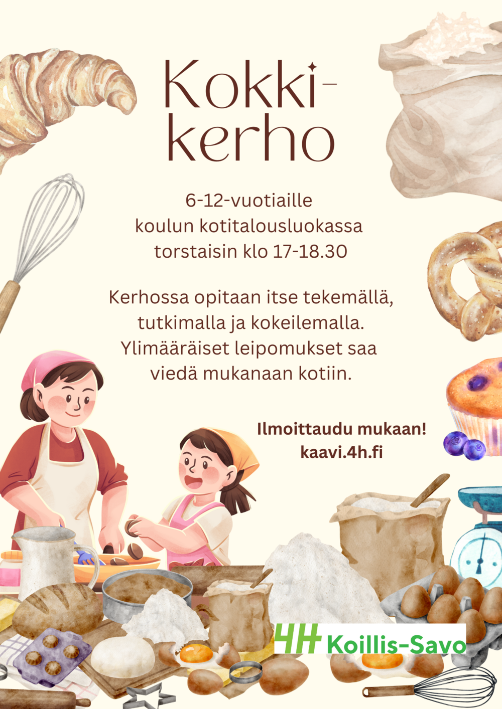 Kokkikerho 6-12-vuotiaille kokoontuu koulun kotitalousluokassa torstaisin klo 17-18.30. Ensimmäinen kerhokerta 2.10. tai kunnes vähintään viisi kerholaista on ilmoittautunut.
