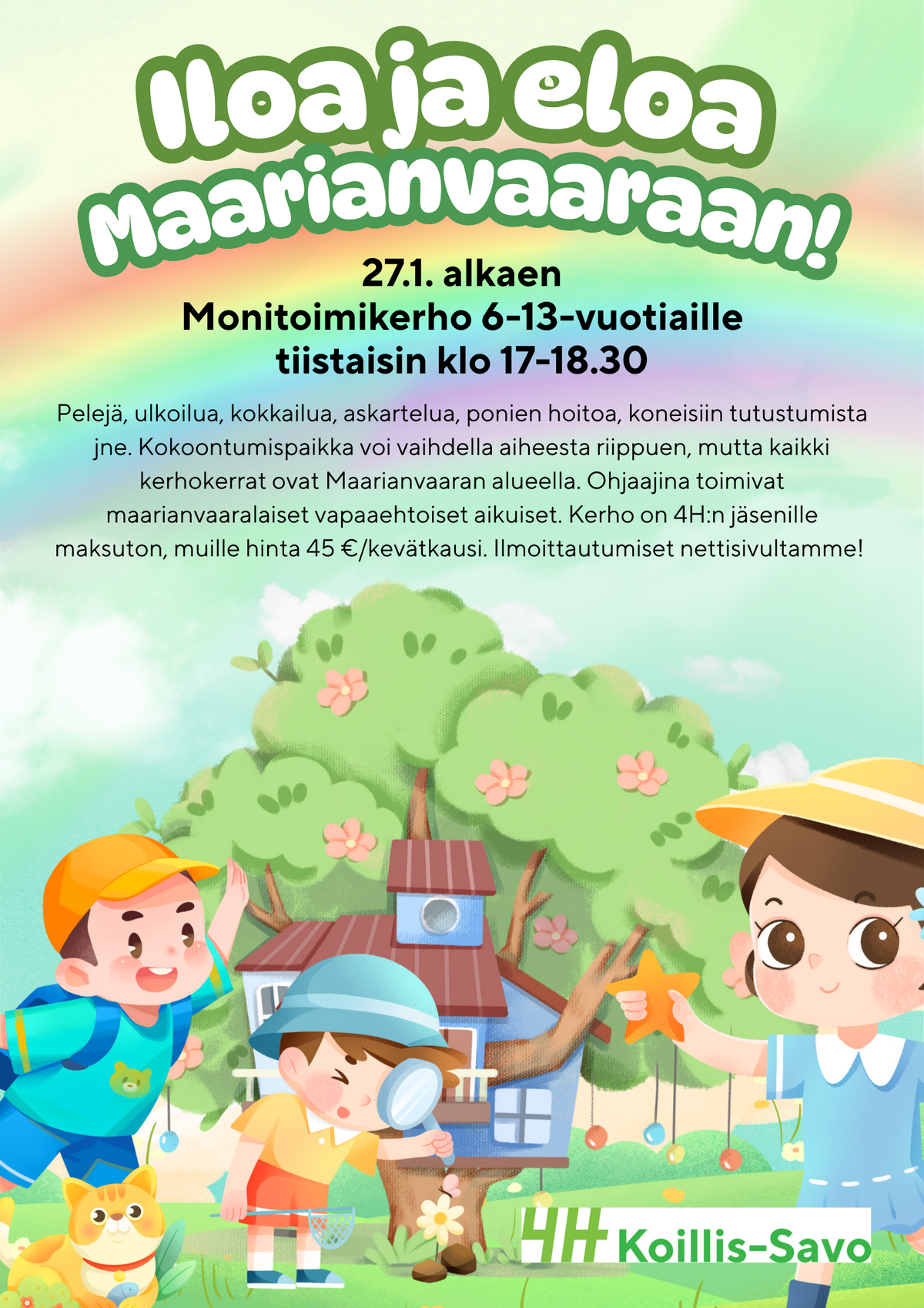 UUSI KERHO! Pelejä, ulkoilua, kokkailua, askartelua, ponien hoitoa, koneisiin tutustumista ja paljon muuta. Kokoontumispaikka voi vaihdella kerhon aiheesta riippuen, mutta kaikki kerhokerrat ovat kuitenkin Maarianvaaran alueella ja kiintopisteenä toimii metsästysmaja (Outokummuntie 1347). Kerho kokoontuu tiistaisin klo 17-18.30. Ohjaajina toimivat maarianvaaralaiset vapaaehtoiset aikuiset.